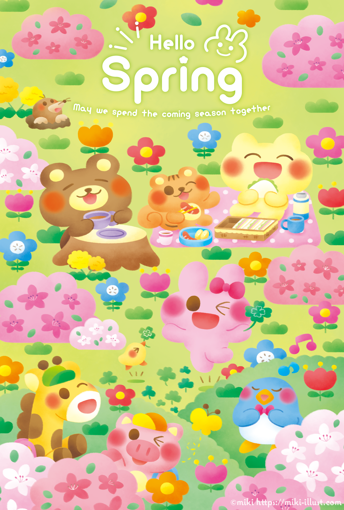 The animals are having a picnic with their friends in the flowers and enjoying the spring.