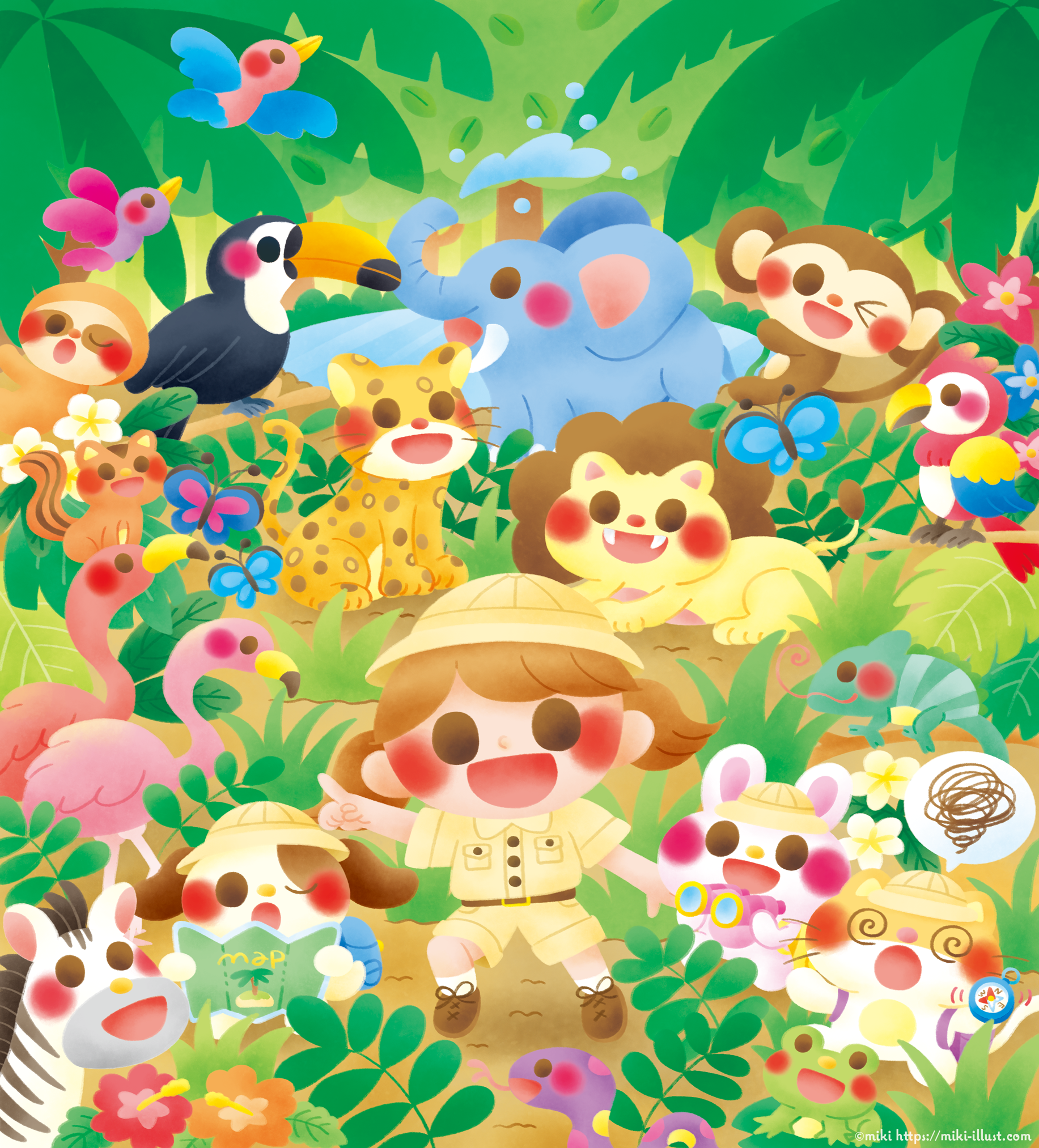 I drew a girl exploring the jungle, her friends' animals, and the flowers and wild animals that live in the jungle.