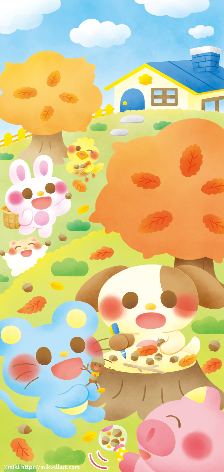 The animals are playing with acorns in the autumn park.