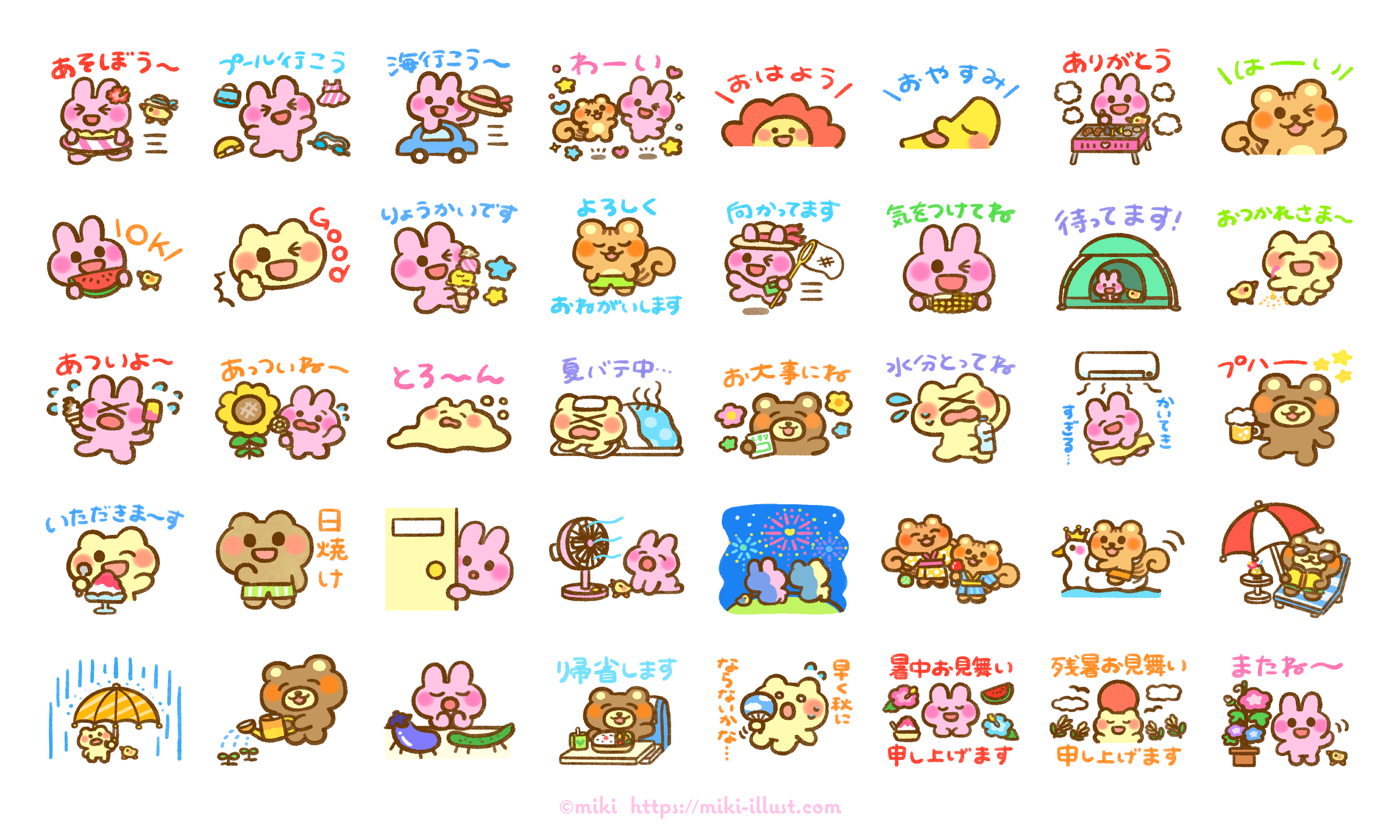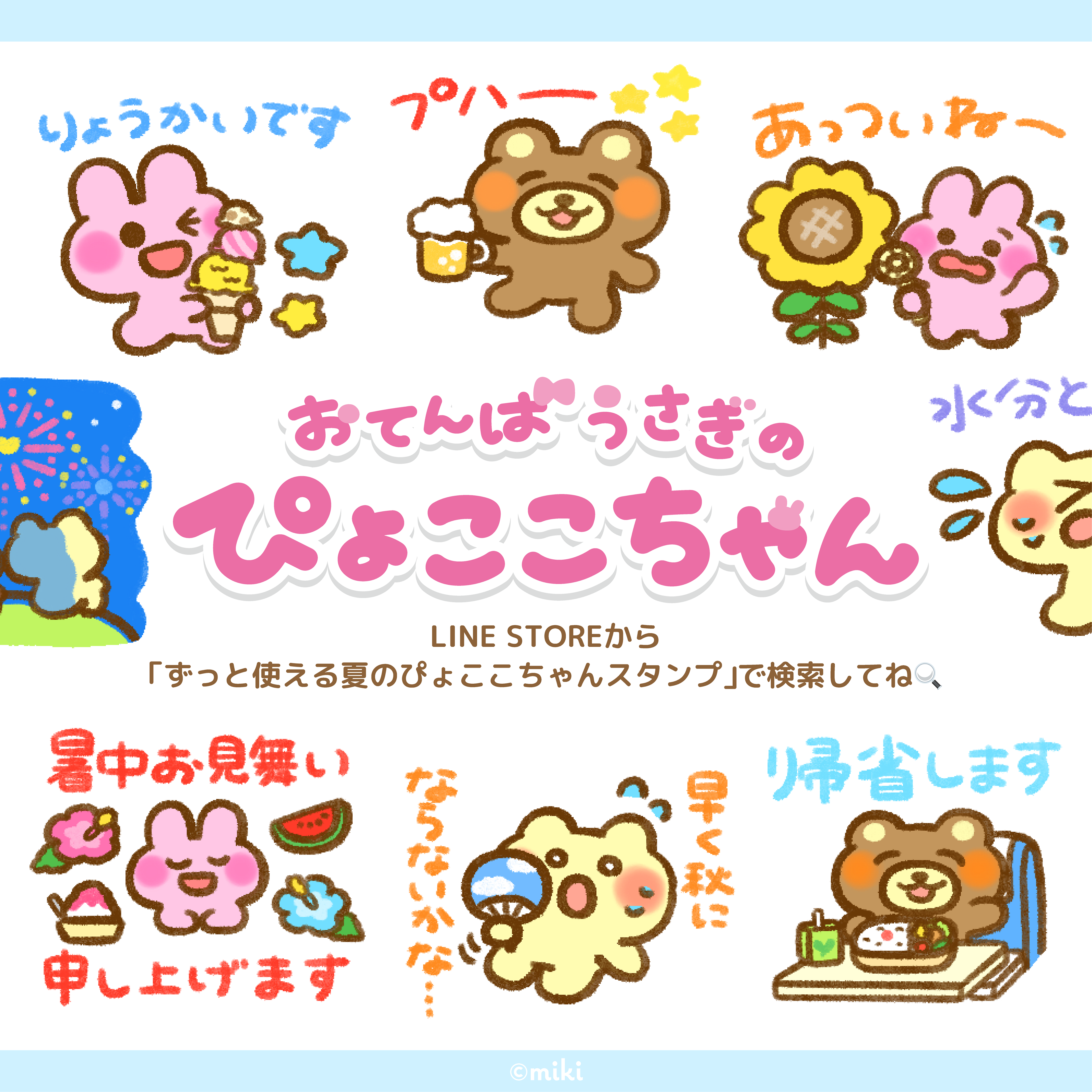 These stamps feature the tomboy rabbit Pyokoko-chan and include many summer situations, such as summer vacation and festivals! (Greetings, honorifics, extreme heat, heavy rain, Obon, etc.) https://store.line.me/stickershop/product/31063978/ja